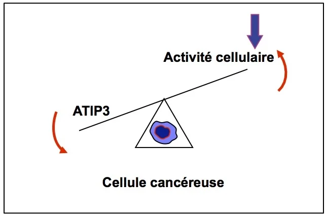 Nous avons montré qu’ATIP3 fonctionne comme un frein dans la cellule. Une déficience en protéine ATIP3 entraine alors un déséquilibre, conduisant à l’accélération d’une activité cellulaire pro-cancer. Notre but à terme est de bloquer cette activité cellulaire à l’aide de composés-médicaments.